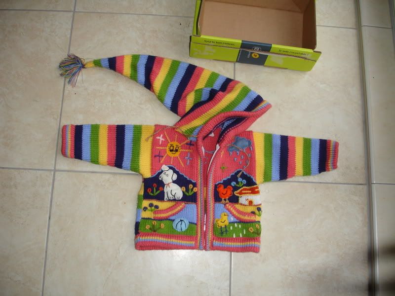 I'm so excited! Kaitlyn got to open an early Christmas present today from Banjo and Lauren. What was it??? Well, it has to be the CUTEST jacket sweater EVER!! Handmade from Chile, I might add. A rare gem! This was so very sweet of Banjo and Lauren! Now we have to go Christmas shopping (luckily one of my favoite things) to find an equally cute gift for little BJ! THANKS LAUREN :)